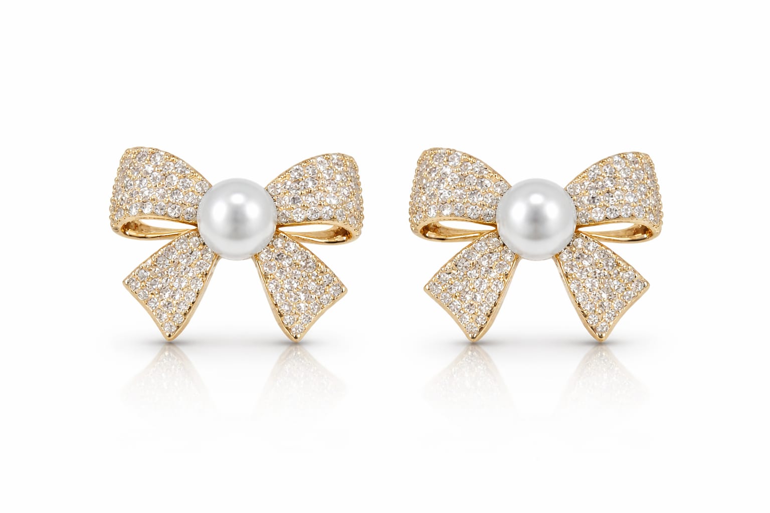 Anti Tarnish Gold Bow Pearl Stud Earrings with American Diamonds