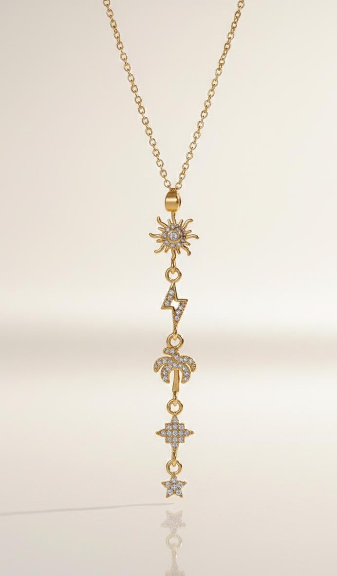 Make a bold style statement with this stunning Anti Tarnish Gold Charm Drop Necklace. Designed with a trendy vertical arrangement of symbolic charms — sun, lightning bolt, palm tree, star, and sparkling motifs — this necklace blends modern fashion with playful elegance.
