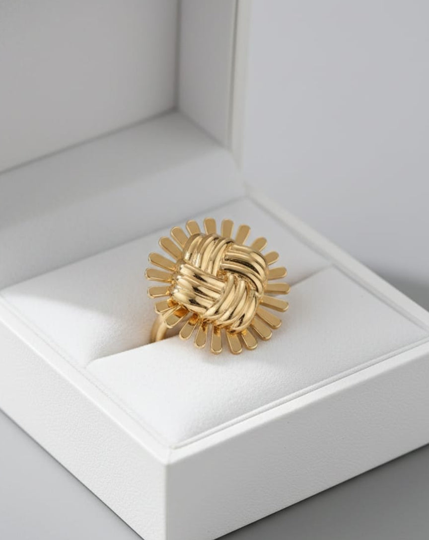 Elevate your look with this anti-tarnish cocktail ring from Quirky Shine, designed to make a bold yet elegant statement. Featuring an intricate woven gold-tone centerpiece framed by a radiant sunburst edge, this ring blends modern artistry with timeless glamour.