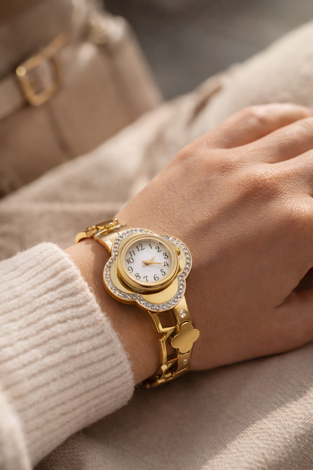 Elevate your wristwear with the Regal Bloom Gold Anti-Tarnish Openable Watch Bracelet, a perfect fusion of jewellery elegance and timekeeping. Featuring a floral-inspired round dial framed with a sparkling crystal bezel, this watch bracelet adds refined glamour to every look.
