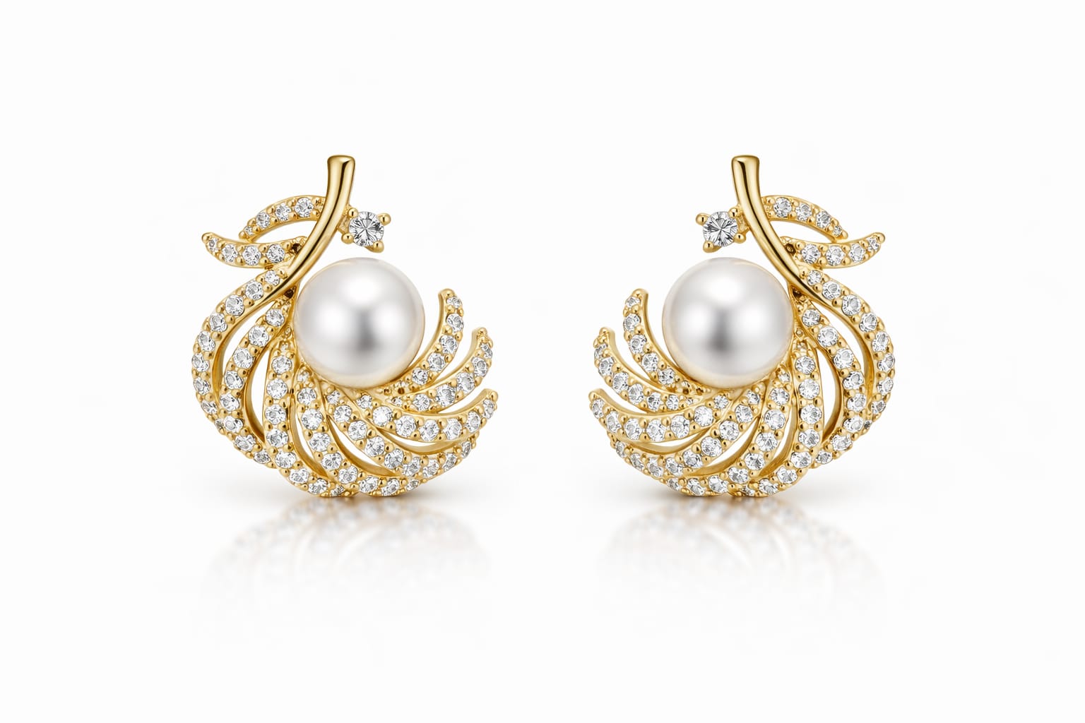 The intricate swirl detailing enhances the sparkle, while the pearl centerpiece adds a soft, graceful touch. Lightweight yet statement-making, these earrings are designed for comfort and glamour.