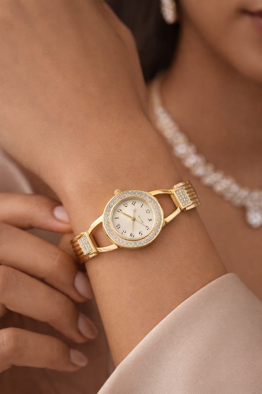 Upgrade your everyday style with our Anti-Tarnish Gold-Toned Bracelet Watch, a perfect blend of jewelry elegance and timeless functionality. Designed with a sleek bangle-style bracelet strap and a crystal-accented round dial, this watch adds a refined, luxurious touch to any outfit. The premium anti-tarnish gold-toned finish ensures long-lasting shine and durability, making it ideal for daily wear as well as special occasions.