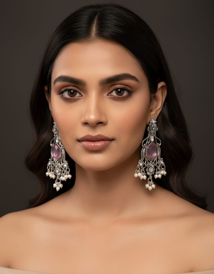 Add an irresistible touch of elegance to your festive and contemporary looks with these antique silver-plated pink stone dangler earrings, crafted with intricate detailing and timeless charm. Designed for the modern woman who loves bold accessories, these earrings feature a beautifully carved floral stud that flows into an ornate openwork frame.