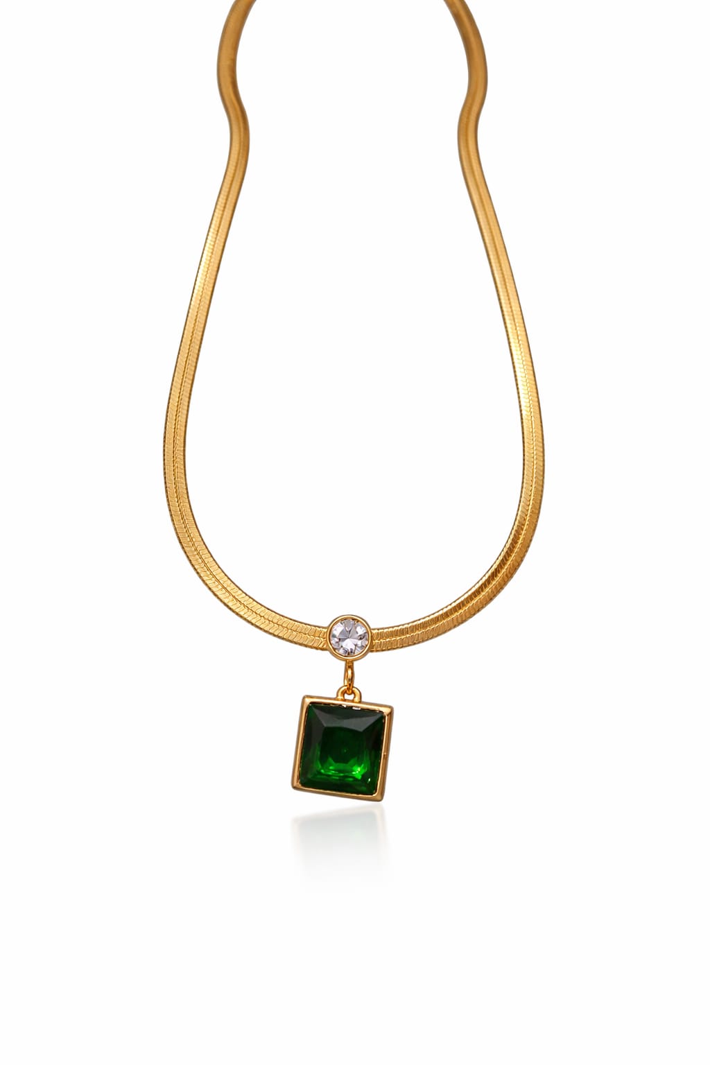 Elevate your everyday elegance with the Emerelle Green Pendant Necklace, a timeless anti-tarnish gold neckchain designed for effortless sophistication. Featuring a sleek gold snake chain and a striking emerald-green square pendant accented with a delicate crystal detail, this piece blends minimal charm with bold color.