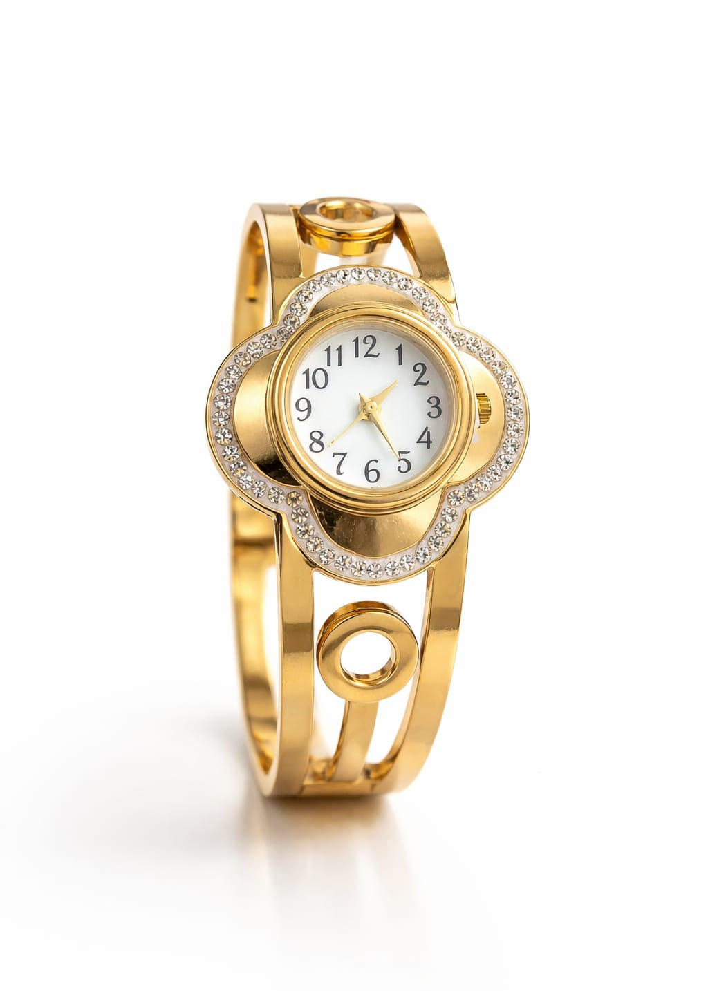 Elevate your accessory game with this Gold Finish Openable Bracelet Watch, designed to blend the elegance of jewellery with the practicality of a timepiece. Featuring a sleek cuff-style bracelet and a classic round dial accented with subtle stones, this watch offers a refined, fashion-forward look.