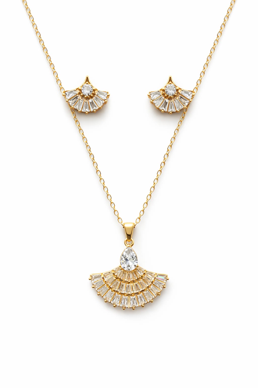 Elegant Gold-Tone Crystal Fan Earrings & Necklace Combo Set