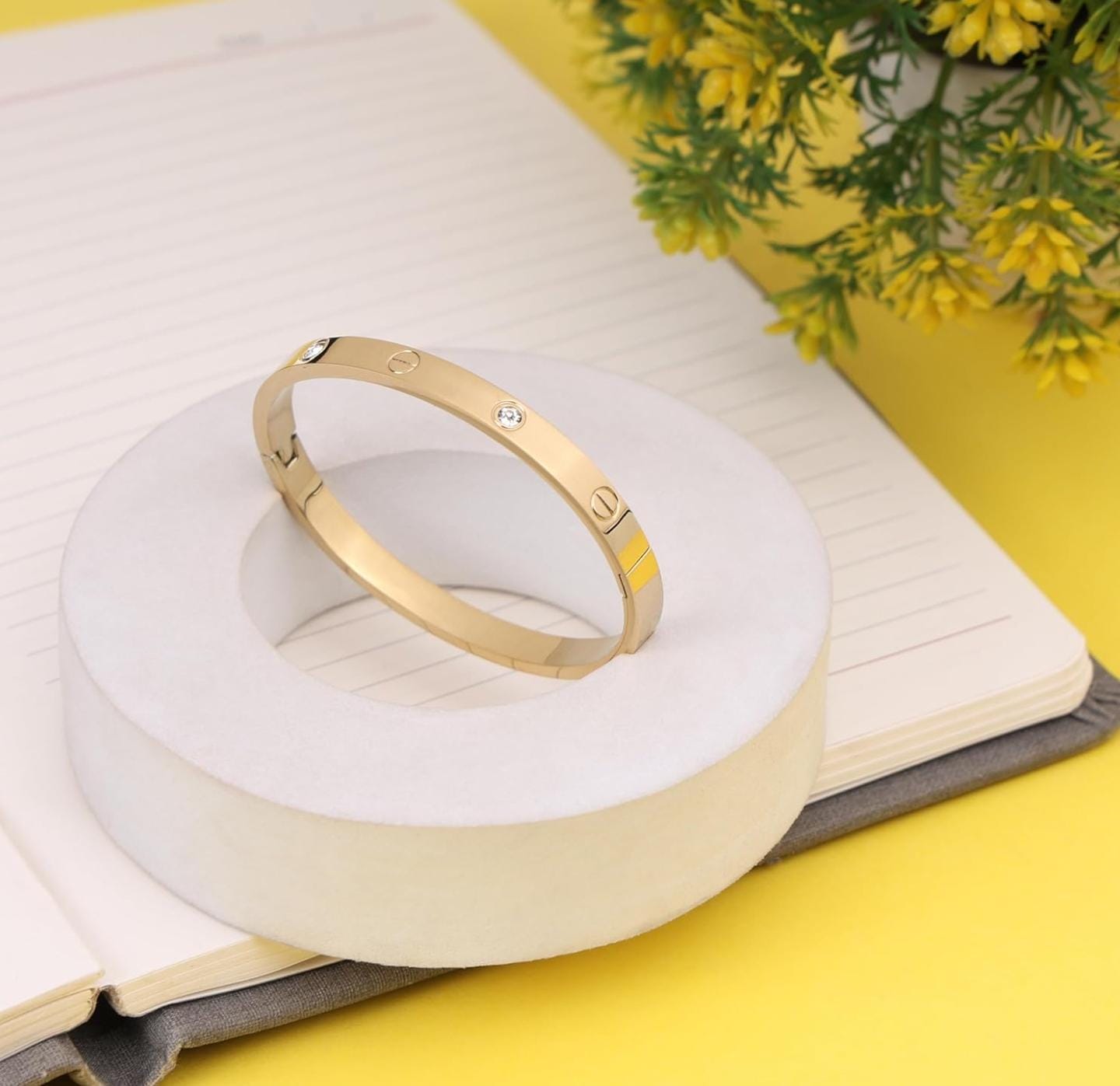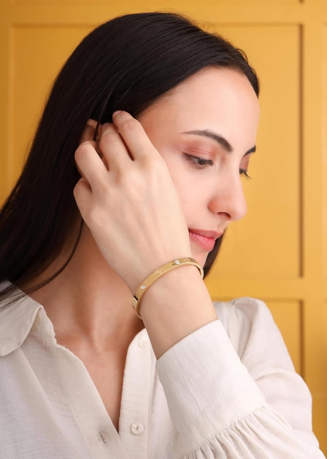 Crafted with a premium anti-tarnish coating, it offers long-lasting shine and resistance to fading, making it ideal for daily wear. The adjustable bangle design ensures a comfortable and secure fit for different wrist sizes, while its smooth, skin-friendly finish allows effortless all-day wear.