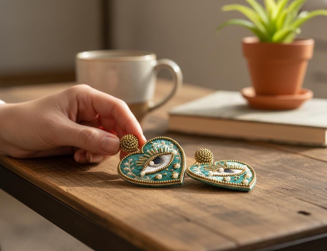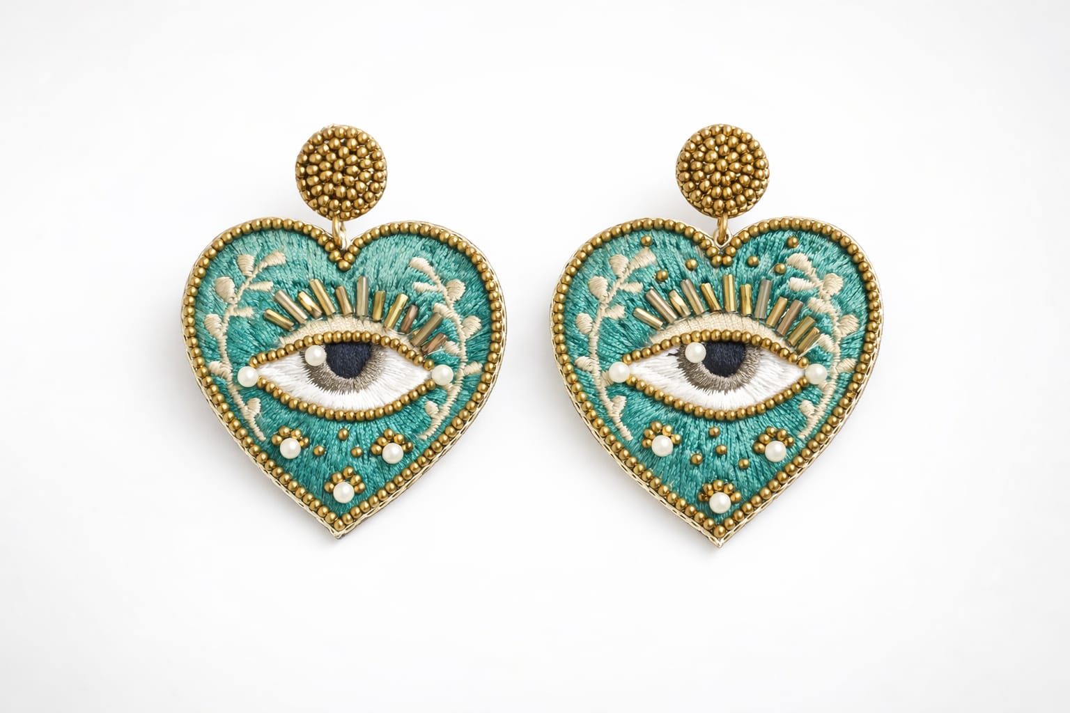 Make a bold artistic statement with these Handmade Evil Eye Heart Earrings, intricately crafted with detailed embroidery and beadwork. Featuring a striking heart-shaped design with an eye motif, these earrings blend symbolism with contemporary handcrafted style.