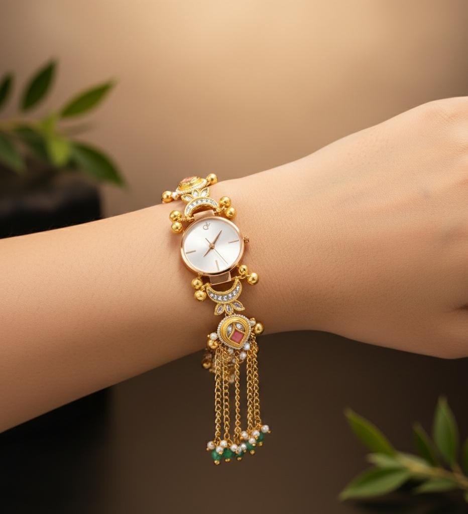 Elevate your ethnic ensemble with this exquisite Kundan Meenakari Watch Bracelet, where traditional Indian craftsmanship meets contemporary timekeeping. Crafted for the modern Indian woman, this anti tarnish statement piece features a soft rose gold dial encased in a rose-gold toned circular watch frame, elegantly adorned with hand-set uncut Kundan stones in classic petal and crescent motifs.