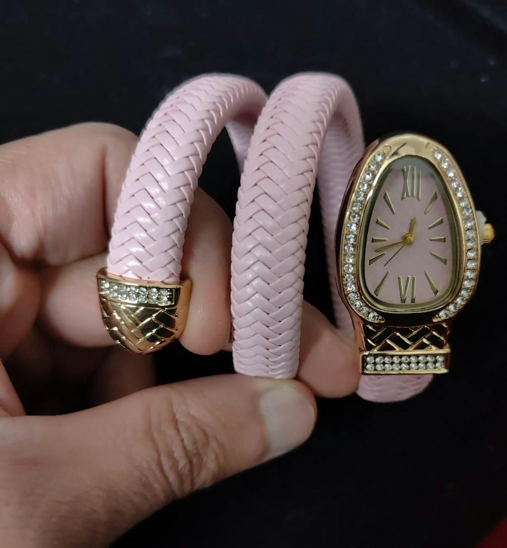 Bold elegance meets modern luxury in the Noir Serpent Dual-Wrap Bracelet Watch. Designed with a sleek pink braided snake-style bracelet, this statement timepiece wraps gracefully around the wrist, creating the look of layered jewellery with the function of a watch.