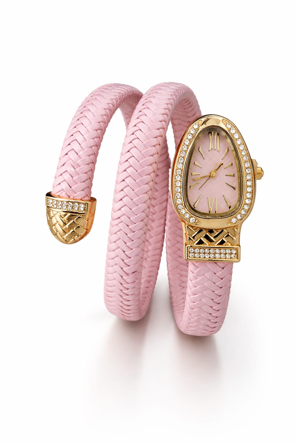 The gold-tone oval dial is framed with shimmering crystal accents, complemented by Roman numeral markers for a refined finish. The dual-wrap snake design offers a secure yet comfortable fit, making it perfect for both day wear and evening styling. A striking fusion of fashion and function, this bracelet watch elevates any outfit effortlessly.