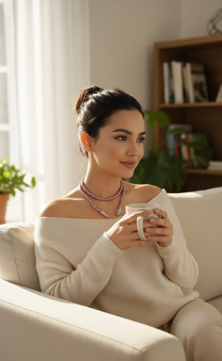 Add versatility to your jewellery collection with the Azure Serpent Convertible Necklace & Wrap Bracelet, a stylish multiwear piece designed for modern, effortless styling. Featuring pink-toned beads with metallic accents, this statement accessory can be worn as a necklace or wrapped around the wrist as a layered bracelet, giving you two looks in one elegant design.